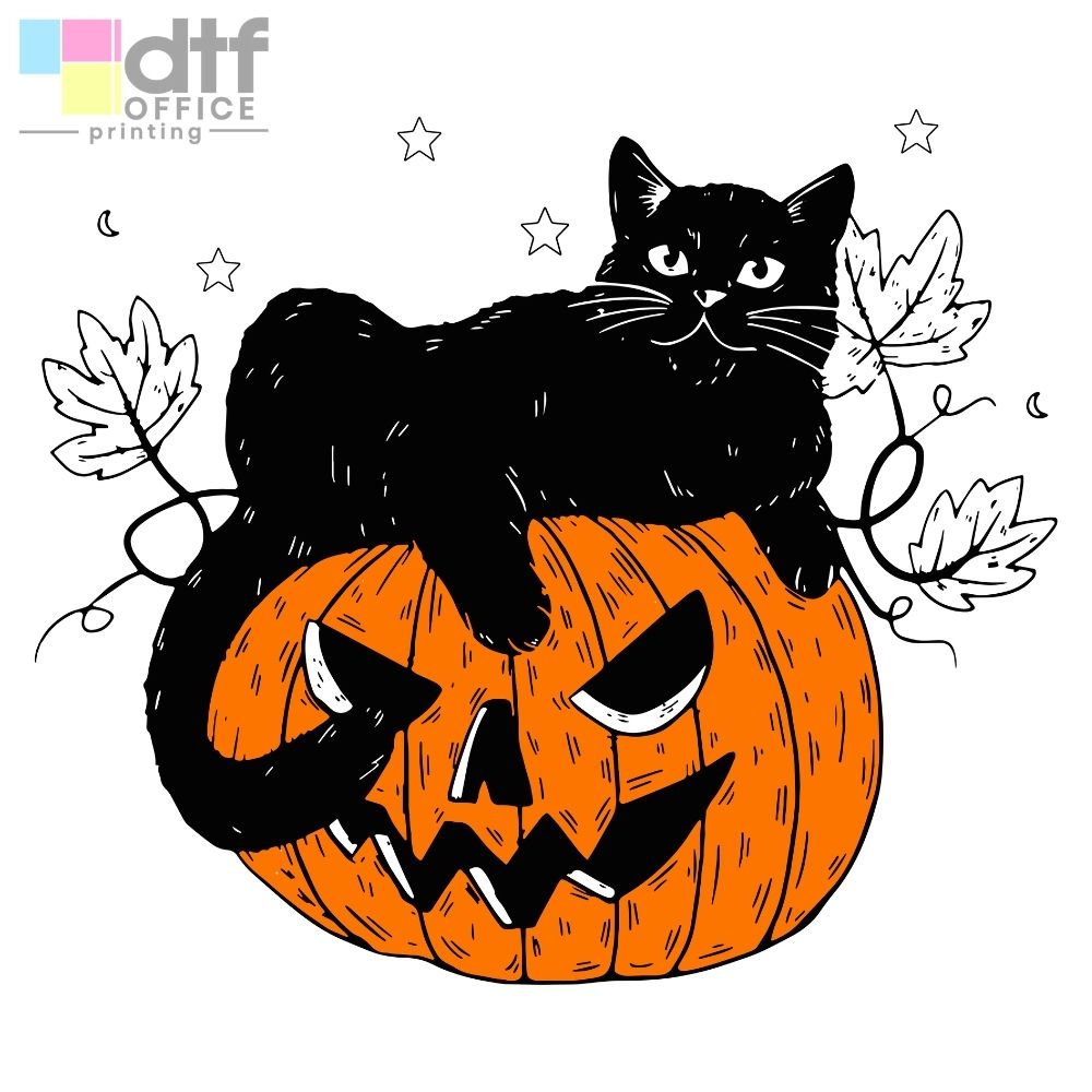Pumpkin and Black Cat DTF Transfer: A classic Halloween pairing featuring a pumpkin and a mischievous black cat.