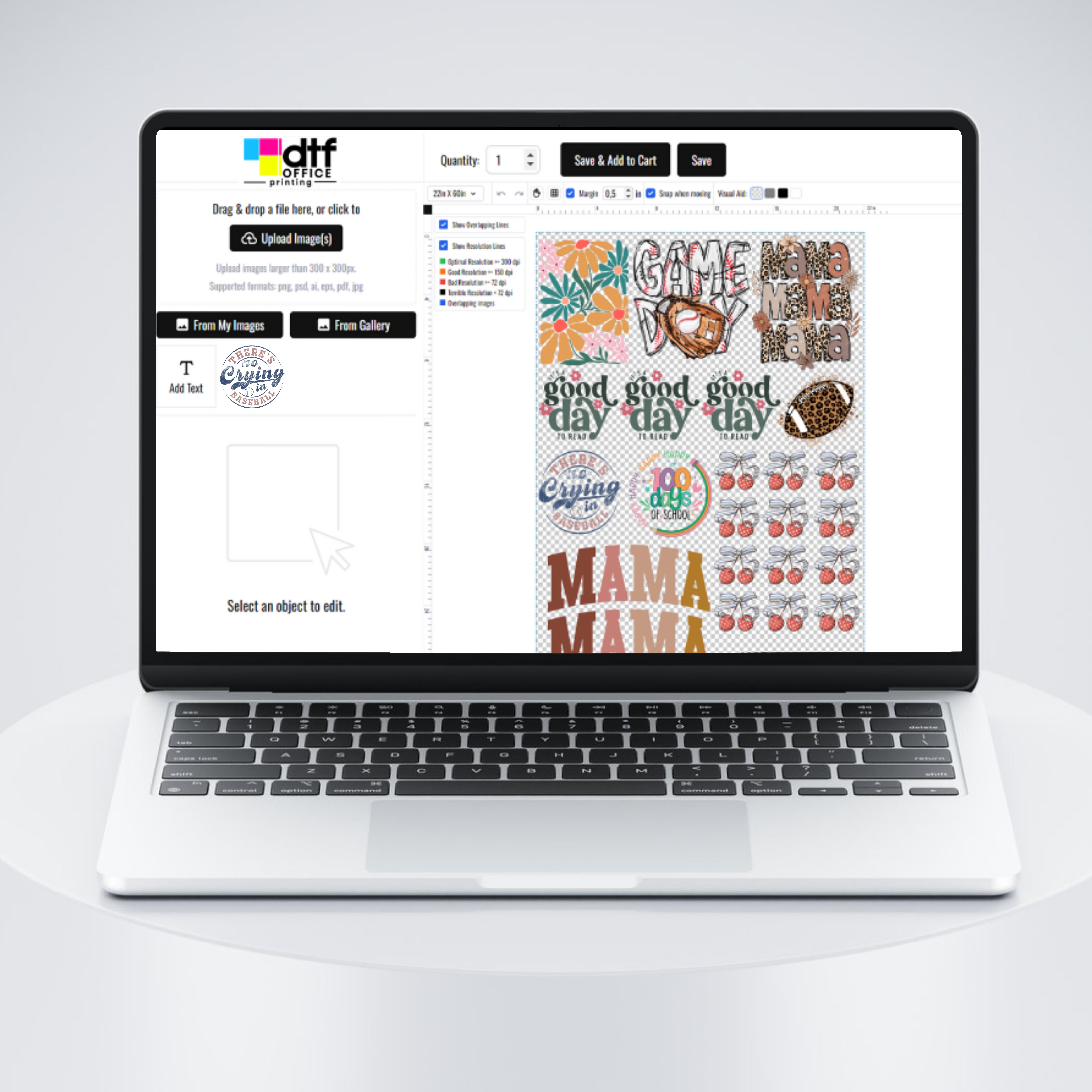 You can create your custom UV DTF transfers using our website's "Build Your Gang Sheet" tool, which has a straightforward interface and can be adjusted to fit different t-shirt sizes. Once you've finished your design, you may place your order with approval. You can turn everything you imagine into a design and send it to us. Your UV DTF wraps will be ready for printing and will reach you within a few days.
